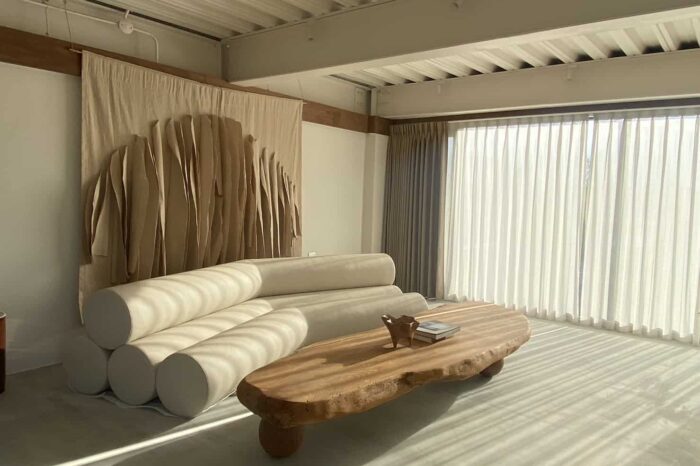 大膽的使用鐵和原木搭配,營造出獨特的氛圍 這層樓裝滿設計與美學相關書籍,形成一個豐富的知識寶庫。 每當黃昏時分,從雪山山脈射來的暖黃色光線灑在客廳,將整個空間染成 金色,為藝術空間增添了溫暖的氛圍。